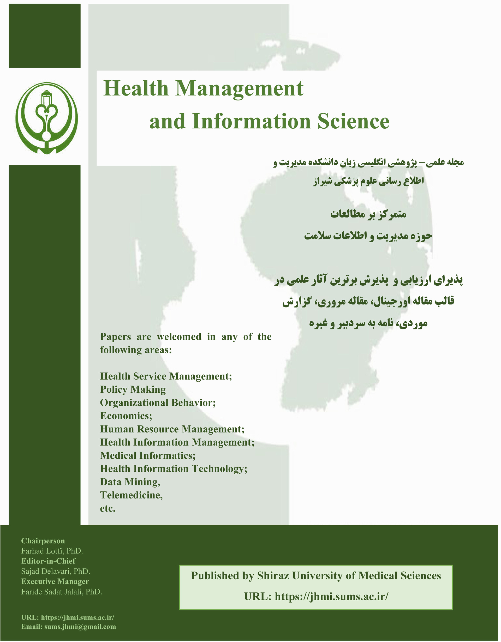 به اطلاع علاقمندان می رساند، مجله علمی پژوهشی دانشکده مدیریت و اطلاع رسانی دانشگاه علوم پزشکی شیراز با عنوان Journal of Health Management & Information Science (JHМІ)" و نمایه در پایگاه های بین المللی از جمله EBSCO، DOAJ،ISCو IMEMR ،Emro در زمینه مدیریت و اطلاعات سلامت منتشر می شود.