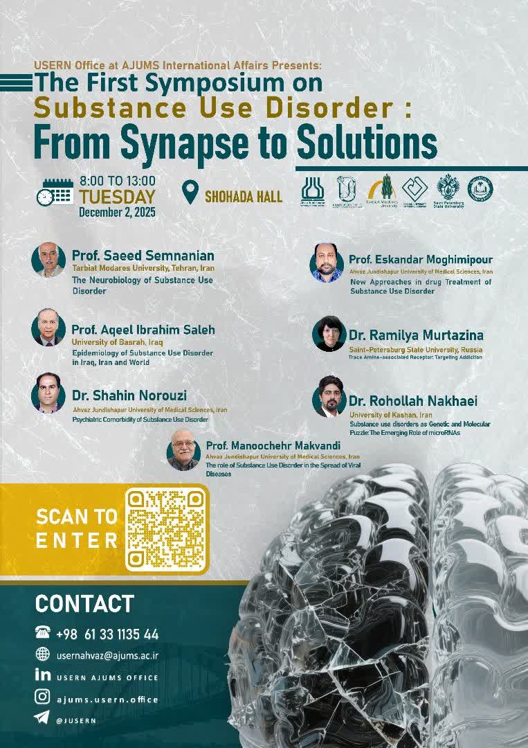 به اطلاع علاقمندان می رساند  سمپوزیوم بین المللی با عنوان: Substance Use Disorders: From Synapses to Solutions به صورت حضوری - مجازی توسط مدیریت امور بین الملل دانشگاه علوم پزشکی جندی شاپور اهواز در تاریخ سه شنبه ۱۱ آذر ۱۴۰۴ ساعت ۸ الی ۱۳ برگزار می گردد.