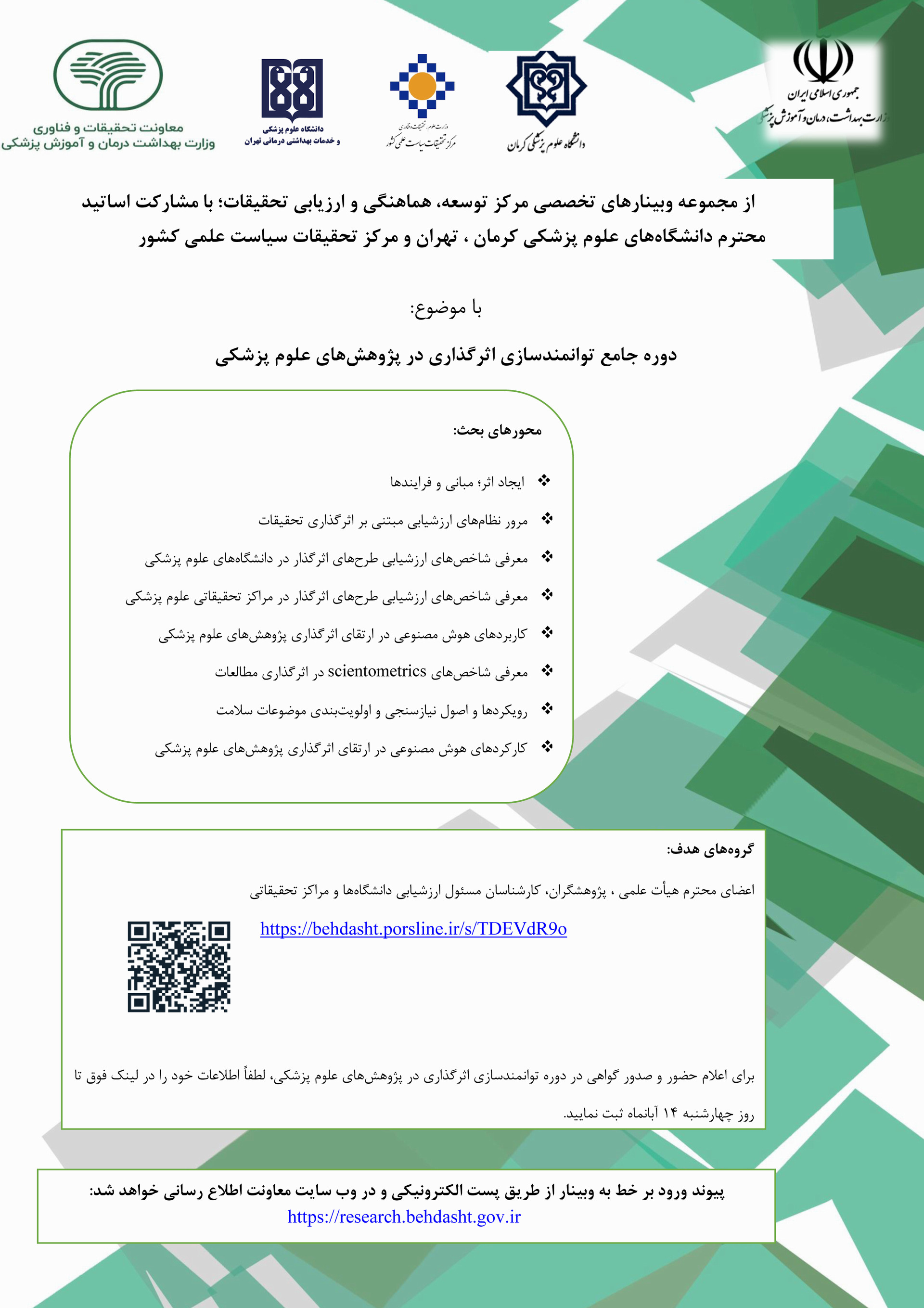 همچنین پیوند ورود بر خط به وبینار از طریق پست الکترونیکی و در وب سایت معاونت اطلاع رسانی خواهد شد. https://research.behdasht.gov.ir