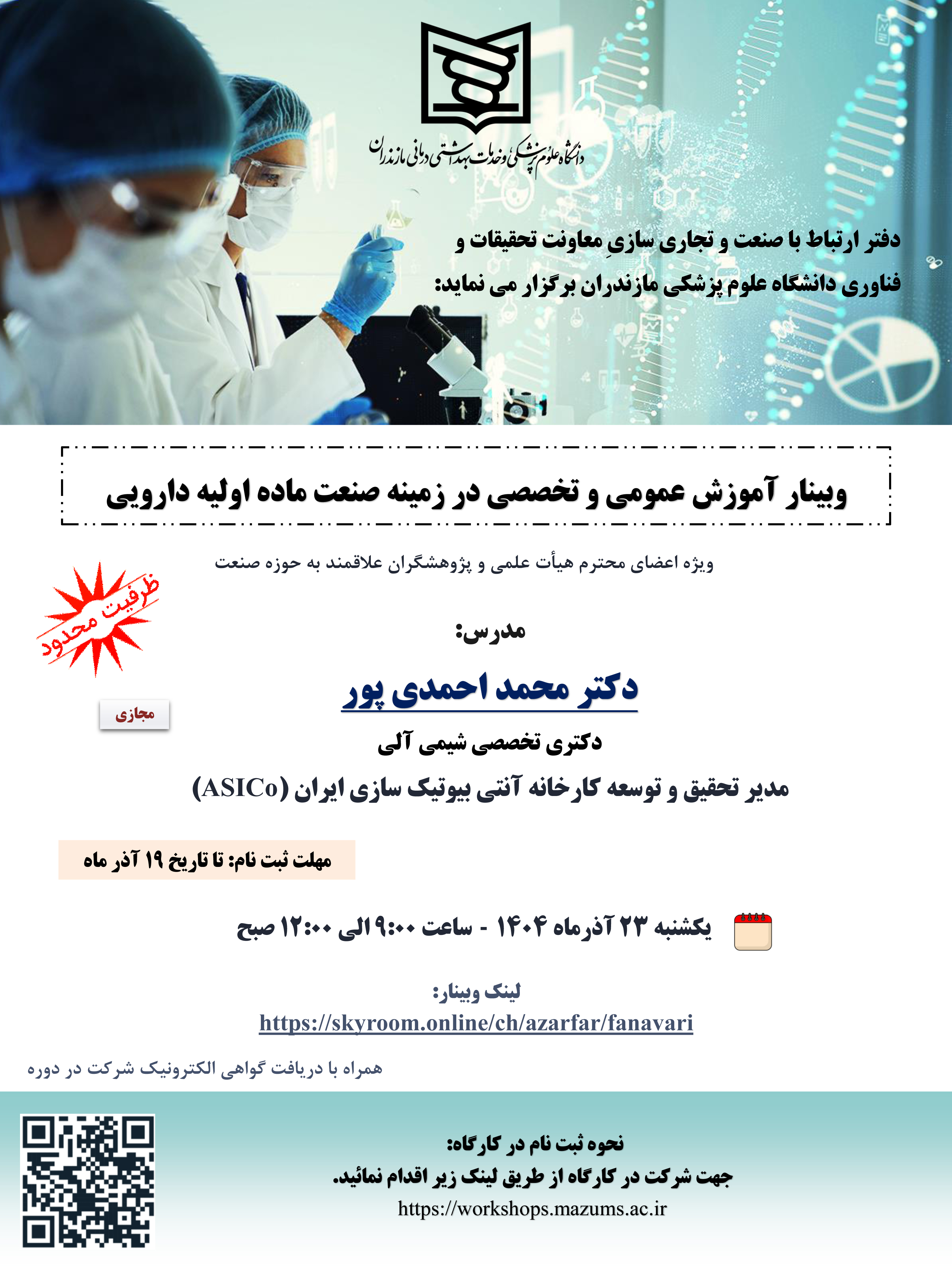 به اطلاع علاقمندان می رساند وبینار آموزشی تحت عنوان آموزش عمومی و تخصصی در زمینه صنعت مواد اولیه دارویی « در روز یکشنبه مورخ ۱۴۰۴/۰۹/۲۳ از ساعت ۰۹:۰۰ الی ۱۲:۰۰ توسط دفتر ارتباط با صنعت و تجاری سازی مدیریت توسعه فناوری معاونت تحقیقات و فناوری دانشگاه علوم پزشکی مازندران برگزار می گردد.