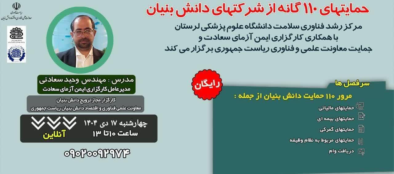 به اطلاع علاقمندان می رساند معاونت تحقیقات و فناوری دانشگاه علوم پزشکی لرستان با همکاری کارگزاری ایمن آزمای سعادت و با حمایت معاونت علمی فناوری و اقتصاد دانش بنیان ریاست جمهوری در نظر دارد کارگاه آموزشی حمایت های ۱۱۰ گانه از شرکت های دانش بنیان را در تاریخ چهارشنبه ۱۷ دی ساعت ۱۰ الی ۱۳ به صورت و بینار برگزار نماید. این وبینار با هدف معرفی آخرین فرصتها تسهیلات و حمایت های دولتی و خصوصی برای شرکت های برگزار می گردد.