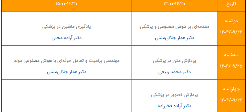 به اطلاع علاقمندان میرساند واحد آموزش پژوهشگاه علوم و فناوری اطلاعات ایران ایرانداک با بیش از ۴۰ سال سابقه برگزاری دوره های آموزشی تخصصی در پاییز ١٤٠٤، مدرسه کاربرد هوش مصنوعی در پزشکی را برای دانشجویان تحصیلات تکمیلی و پژوهشگران همراه با اعطای گواهی نامه به شرح جدول زیر برگزار خواهد کرد .